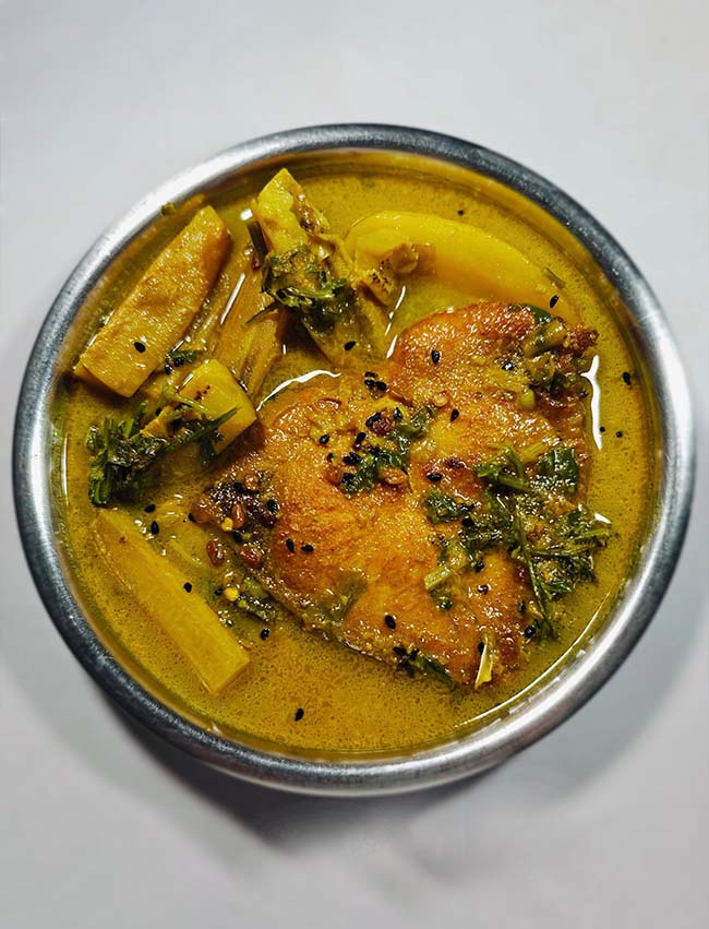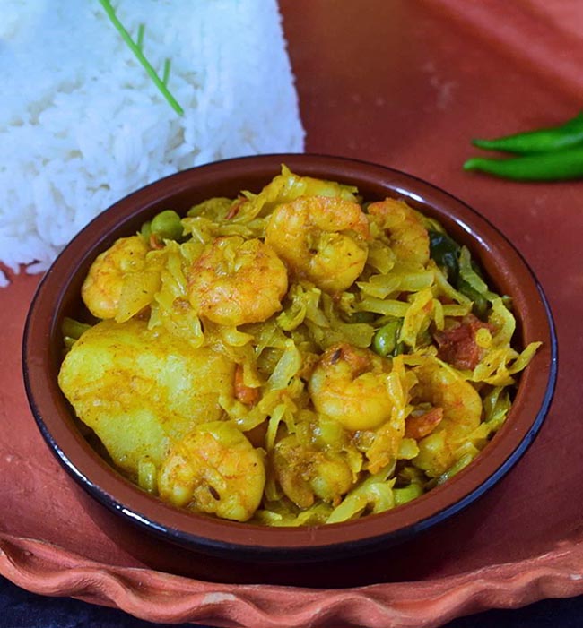 In our series of classical bangali recipes that go well with our various types of husking rice (that retains most nutrients naturally found in rice) we had started with bitter and went on to daal and had to accompany it, a bhaja. Next in a typical bangali menu comes a torkari or a recipe of vegetables (individual or a mixture of few or many) made by itself or with an addition of a non-vegetarian element (fish head or shrimps). Today we will go for a simple yet delicious recipe ‘Kucho Chingri diye Bandhakopir Ghonto’ to add to our menu.